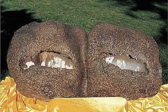 义云高大师甫完成的「神秘石中雾」等雕作,神奇的鹅卵石「神秘石中雾」,从外表上,是一个几呎大的绿玉茅石。但内部却层峦迭嶂,勾网纵横,变幻神奇莫测。其结构之玄妙令人叹为观止。有些地方雾气状如薄纱,有些地方雾浓不见背景,须用防雾灯才能见卢山面貌。其韵气氤缭绕,造化犹叹不如。